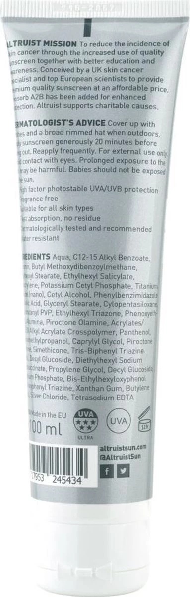 Altruist Zonnebrand Creme SPF 50 is ontwikkeld door dermatologen. Deze dermatologen willen het risico op huidkanker verkleinen door het stimuleren en verhogen van het gebruik van zonbeschermingsproducten samen met een betere kennisoverdracht. Altruist Sun Cream is ontwikkeld voor alle huid typenen is geschikt voor de gevoelige huid omdat het hypoallergeen is en vrij van parabenen en parfum.