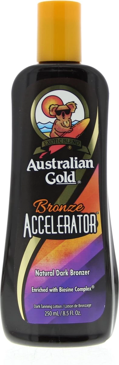 Wil jij graag een Australian Gold bruiningsversneller en wil je niet te veel betalen dan is de Bronze Accelerator zonnebankcrème een goede keuze. De Accelerator is al 20 jaar op de markt en verkoopt nog steeds erg goed. Nu is daar een bronzer aan toegevoegd. Resultaat; een nog sterker product voor een topprijs. Hoge concentraties van o.a. banaanextracten en zwarte walnootextracten zorgen snel voor een mooie, diepbruine kleur. Het Biosine Complex (tea tree olie, olijfolie en provitamine B5) stimuleren bovendien de natuurlijke aanmaak van melanine waardoor je nog sneller bruint. Bijenextracten beschermen de huid tegen invloeden van buitenaf. En wat een huidverzorging met o.a. shea butter, zonnebloemextracten, saffraan olie, vitamine A en E.