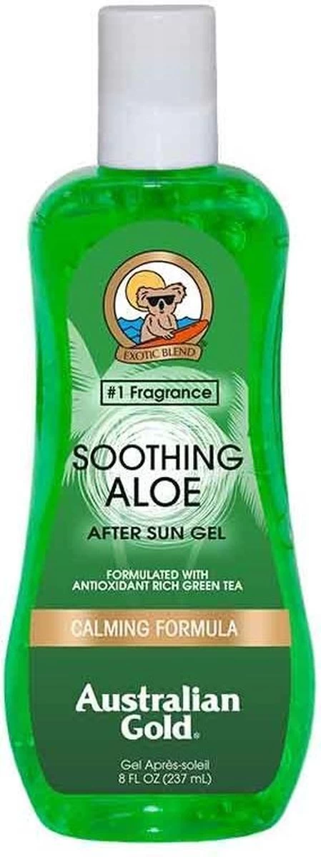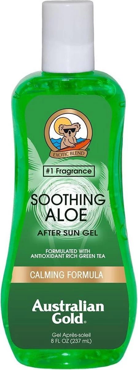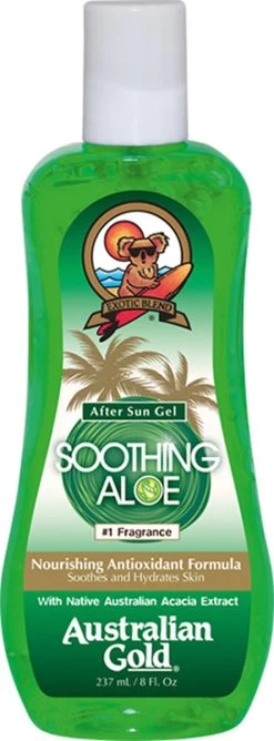 Australian Gold ‘Soothing Aloe After Sun Gel’ is een olievrije gel die je eigenlijk altijd mee moet nemen op vakantie. Want als je huid na een dagje strand licht verbrand is, een beetje irriteert of strak aanvoelt, is deze gel de ideale oplossing. Verkoelt, verfrist en verzacht de huid. Bevat o.a. Aloë Vera, groene thee extracten, Acacia extract, vitamine C, vitamine E en krachtige anti-oxidanten. Kan ook gebruikt worden na een zonnebankje. Tip: in de koelkast bewaren voor een extra verkoelend effect. Zonder toegevoegd parfum, geschikt voor elk huidtype, plakt niet, is niet vet en trekt snel in. Handige meeneemflacon van 237 ml.