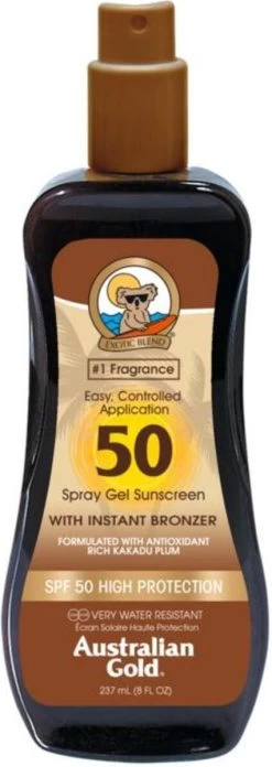 Wil je uitpakken met je spectaculaire kleurtje en terzelfdertijd je huid verzorgen? Dan is Zon Protector Spray Sunscreen Australian Gold SPF 50 (237 ml) precies wat jij nodig hebt! Nu kun je genieten van de Australian Gold zonnebrandcrème en andere tanning lotions of zonne-oliën van 100% originele merken.