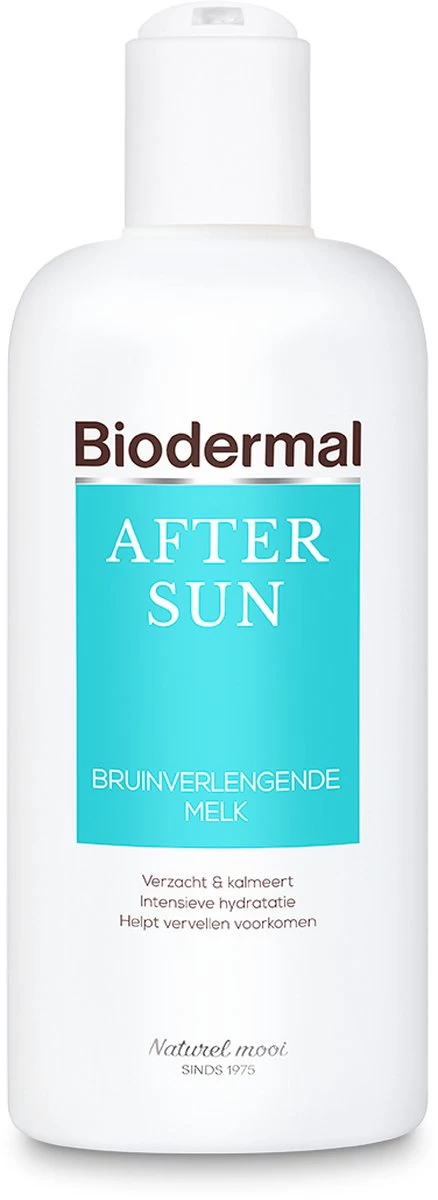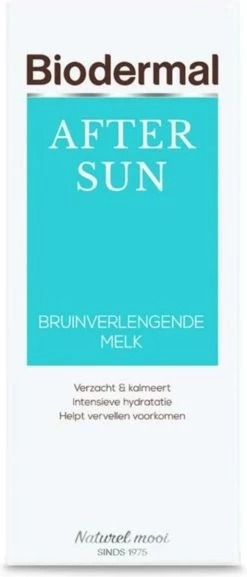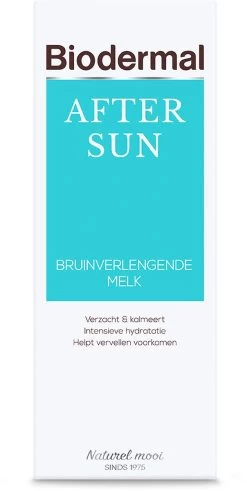 Bruine teint behouden: – Het is begrijpelijk dat je die zorgvuldig opgebouwde bruine teint op je lichaam zo lang mogelijk behouden. Dat kan met een beetje hulp van Biodermal After Sun Bruinverlengende melk. Deze After Sun is verrijkt met Total Tanning System (TTS), dat bekend staat om het stimuleren en het verlengen van de natuurlijke melanineproductie.