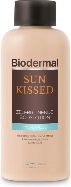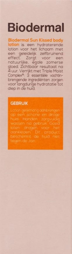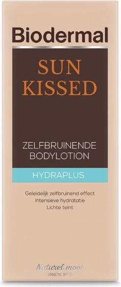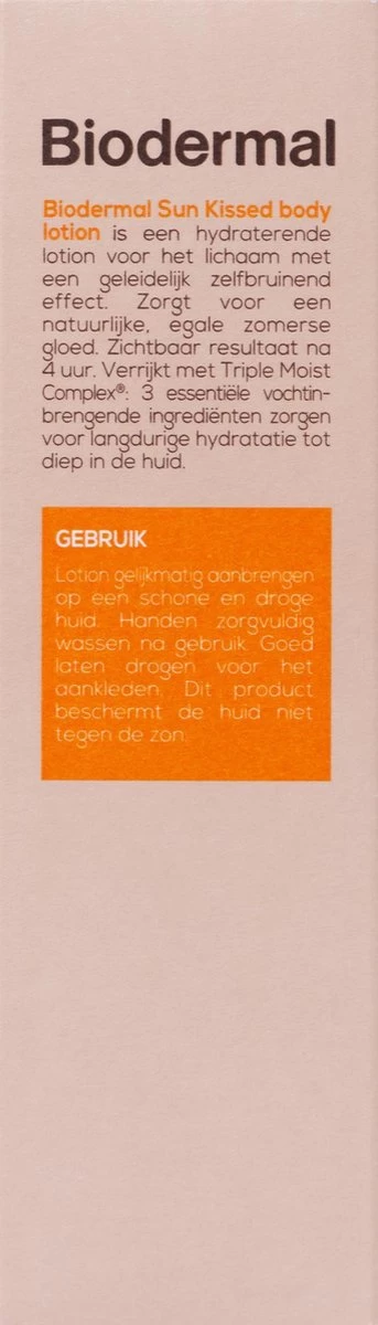 Biodermal Sun Kissed body lotion met een geleidelijke zelfbruinend effect, zorgt voor een natuurlijke zomerse gloed. Geschikt voor lichte tot medium huidtypen. Kan dagelijks gebruikt worden. Bevat Triple Moist Complex: biedt direct intensieve en langdurige hydratatie tot diep in de huid. De lichte formule brengt gemakkelijk aan en trekt snel in.
