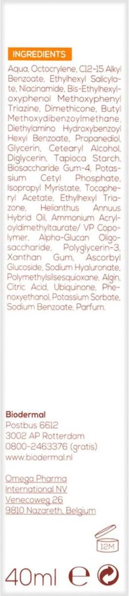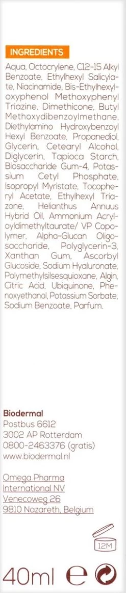 Ingrediënten:Aqua, Octocrylene, C12-15 Alkyl Benzoate, Ethylhexyl Salicylate, Niacinamide, Bis-Ethylhexyloxyphenol Methoxyphenyl Triazine, Dimethicone, Butyl Methoxydibenzoylmethane, Diethylamino Hydroxybenzoyl Hexyl Benzoate, Propanediol, Glycerin, Cetearyl Alcohol, Diglycerin, Tapioca Starch, Biosaccharide Gum-4, Potassium Cetyl Phosphate, Isopropyl Myristate, Tocopheryl Acetate, Ethylhexyl Triazone, Helianthus Annuus Hybrid Oil, Ammonium Acryloyldimethyltaurate/VP Copolymer, Alpha-Glucan Oligosaccharide, Polyglycerin-3, Xanthan Gum, Ascorbyl Glucoside, Sodium Hyaluronate, Polymethylsilsesquioxane, Algin, Citric Acid, Ubiquinone, Phenoxyethanol, Potassium Sorbate, Sodium Benzoate, Parfum