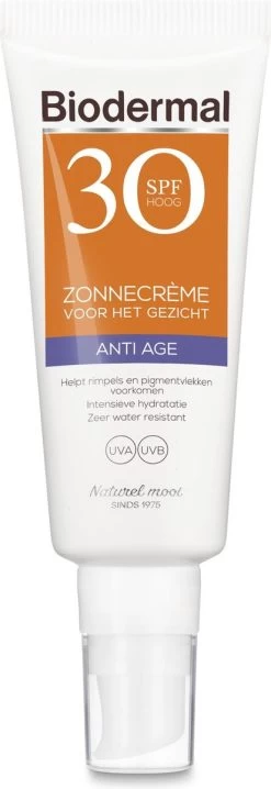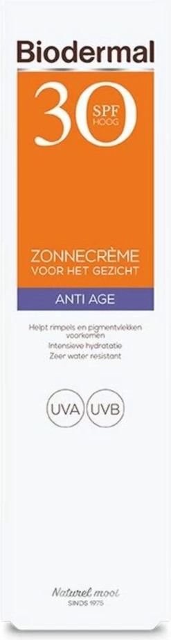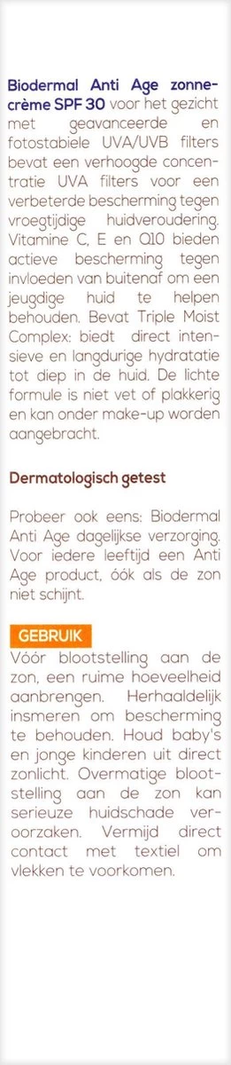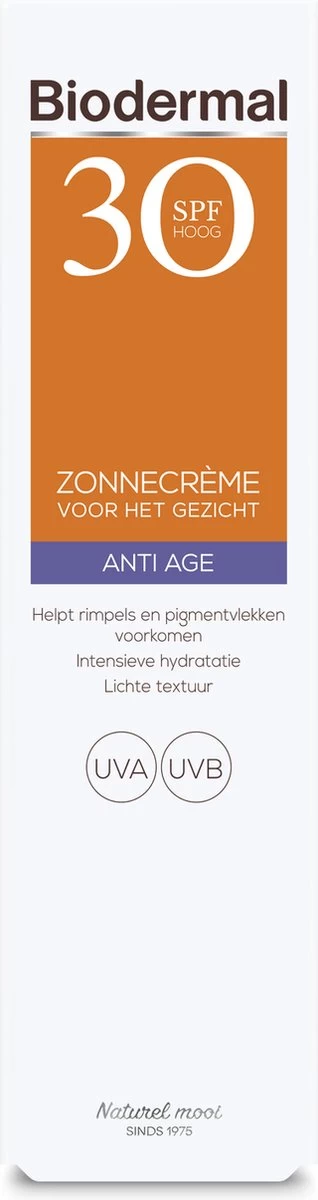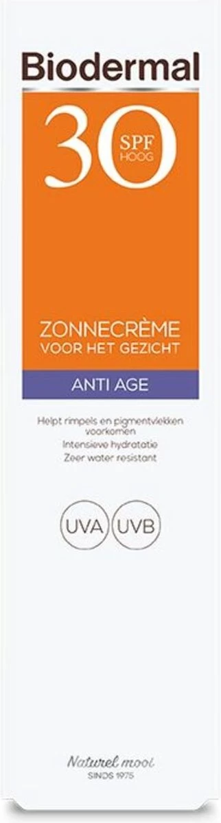 Biodermal Anti Age zonnecrème SPF 30 voor het gezicht bevat meerdere ingrediënten die actieve bescherming bieden tegen invloeden van buitenaf. Ingrediënten zoals vitamine E, C en Q10 helpen om een jeugdige huid te behouden. Deze zonnecrème heeft geavanceerde UVB-/UVA-filters voor een directe en aanhoudende bescherming. De crème draagt daardoor bij aan een verbeterde bescherming tegen vroegtijdige huidveroudering. Het Triple Moist Complex zorgt voor directe, diepe, intensieve en langdurige hydratatie van de huid.