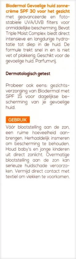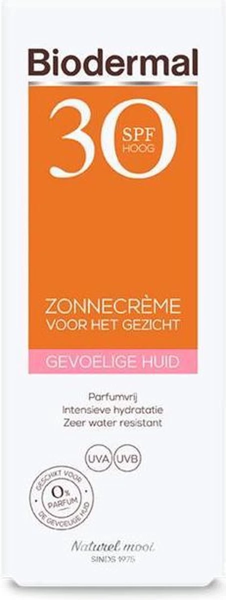 Biodermal gevoelige huid Zonnecrème gezicht SPF 30 is speciaal voor het gezicht ontwikkeld. De zonnecrème is parfumvrij en voorzien van geavanceerde UVB-/UVA-filters voor een directe en aanhoudende bescherming. Het Triple Moist Complex in de zonnecrème zorgt voor directe, diepe, intensieve en langdurige hydratatie van de huid. Deze formule is geschikt voor de gevoelige huid, is niet plakkerig of vet en trekt snel is.