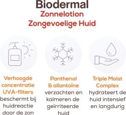 Nieuw van Biodermal Biodermal zonnelotions. Deze zonnebrand is speciaal ontwikkeld voor de zongevoelige en (zeer) droge huid. Geformuleerd met een unieke combinatie van hoog beschermende zonnefilters en huidverzorgende ingrediënten. Om de extra kwetsbare huid intensief te beschermen, verzorgen en versterken.