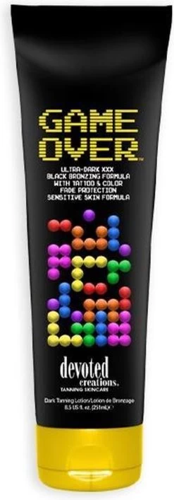 Game Over van Devoted Creations is een hypo-allergene bruiningsversneller die zowel natuurlijke als cosmetische bronzers bevat. De creme hydrateerd de huid zeer goed door de shea butter, hierdoor voelt je huid zijdezacht aan. Daarnaast bevat Game Over een Tattoo & Color Fade Protecting Formula waardoor de kleur van je tatoeages behouden wordt!