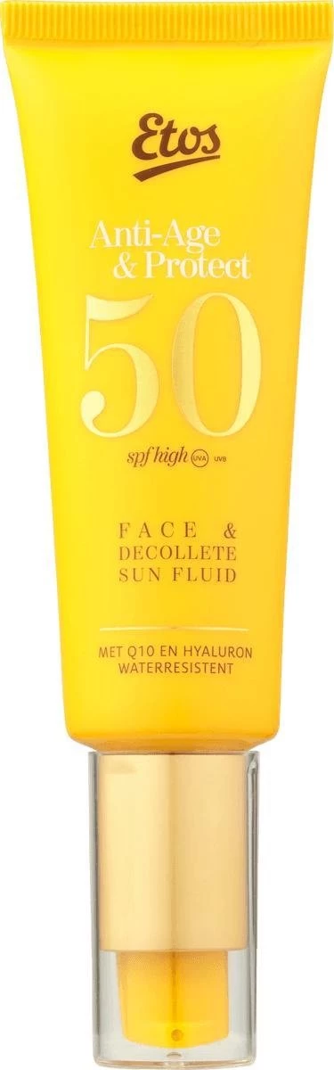 Etos Anti-age face & decolleté SPF50 zonbeschermingsfluïde biedt UV-A en UV-B + IR-A bescherming. De fluïde is een lichte crème die snel intrekt en zorgt ervoor dat de huid tot 24uur gehydrateerd blijft.