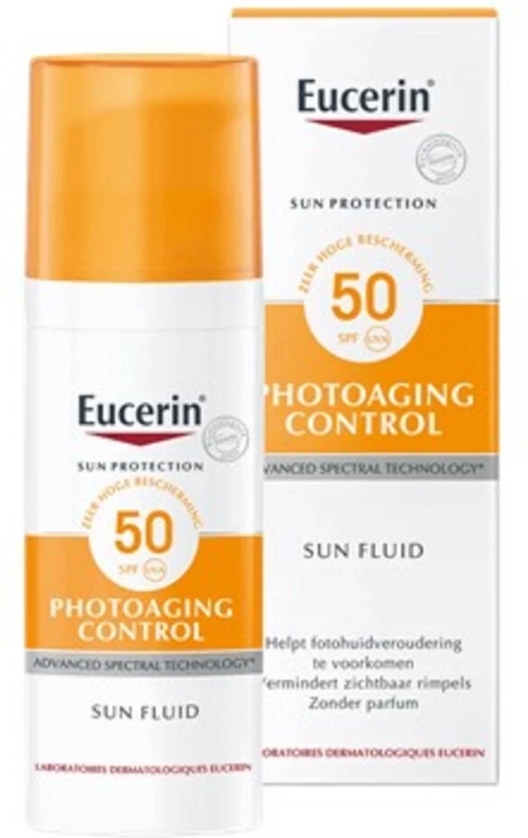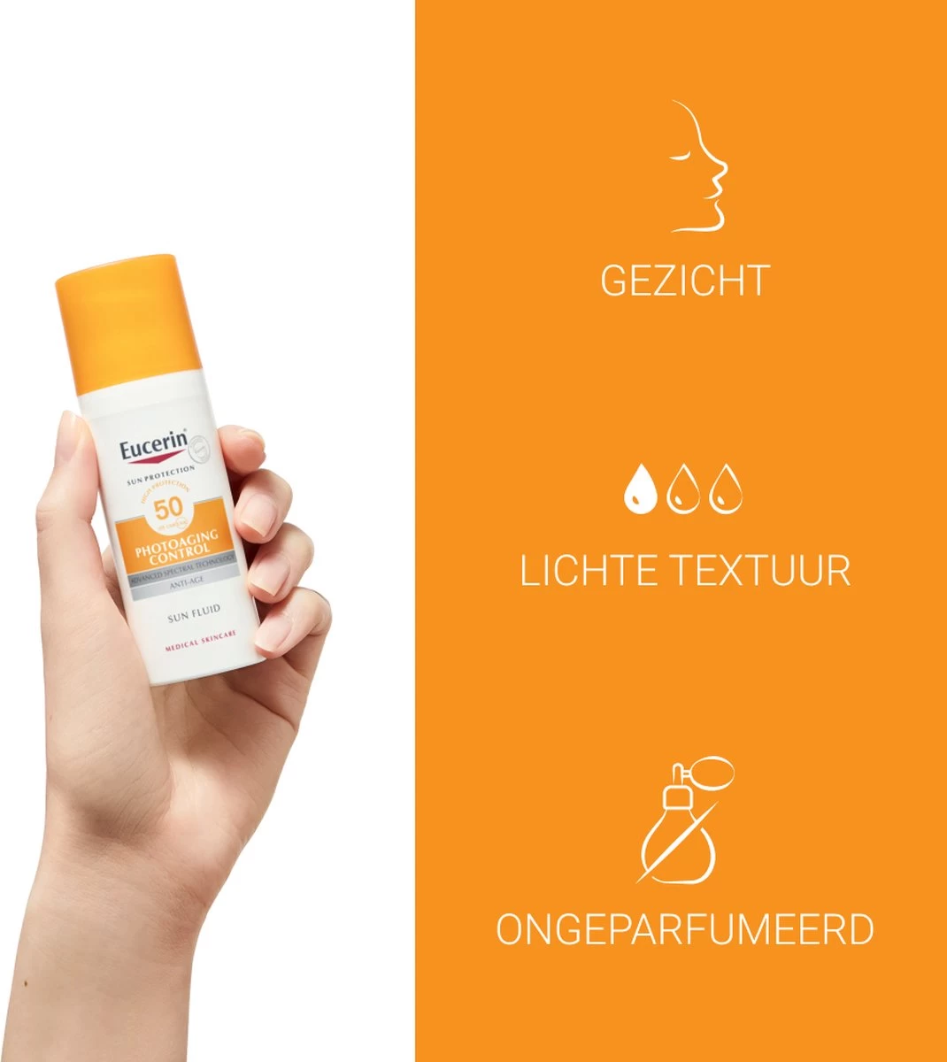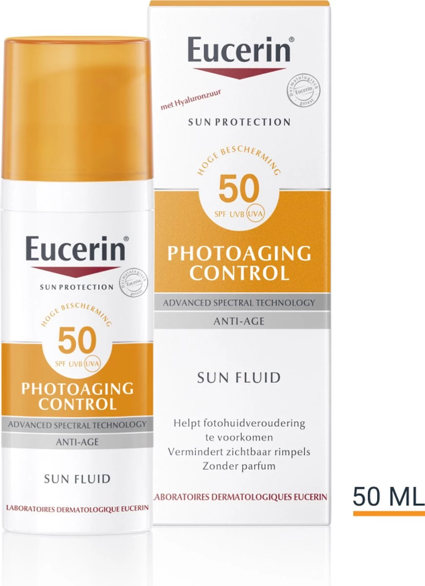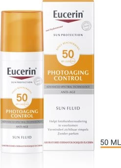 Eucerin Sun Photoaging Control Fluid SPF 50 is een dagelijkse gezichtsverzorging voor elk huidtype die beschermt tegen verbranding door de zon en huidschade, terwijl het de zichtbare tekenen van huidveroudering vermindert. De formule combineert twee geavanceerde technieken die superieure bescherming bieden tegen UV-schade als ouderdomsvlekken en intens hydrateren om te zichtbare rimpels op het gezicht en decolleté te verminderen.