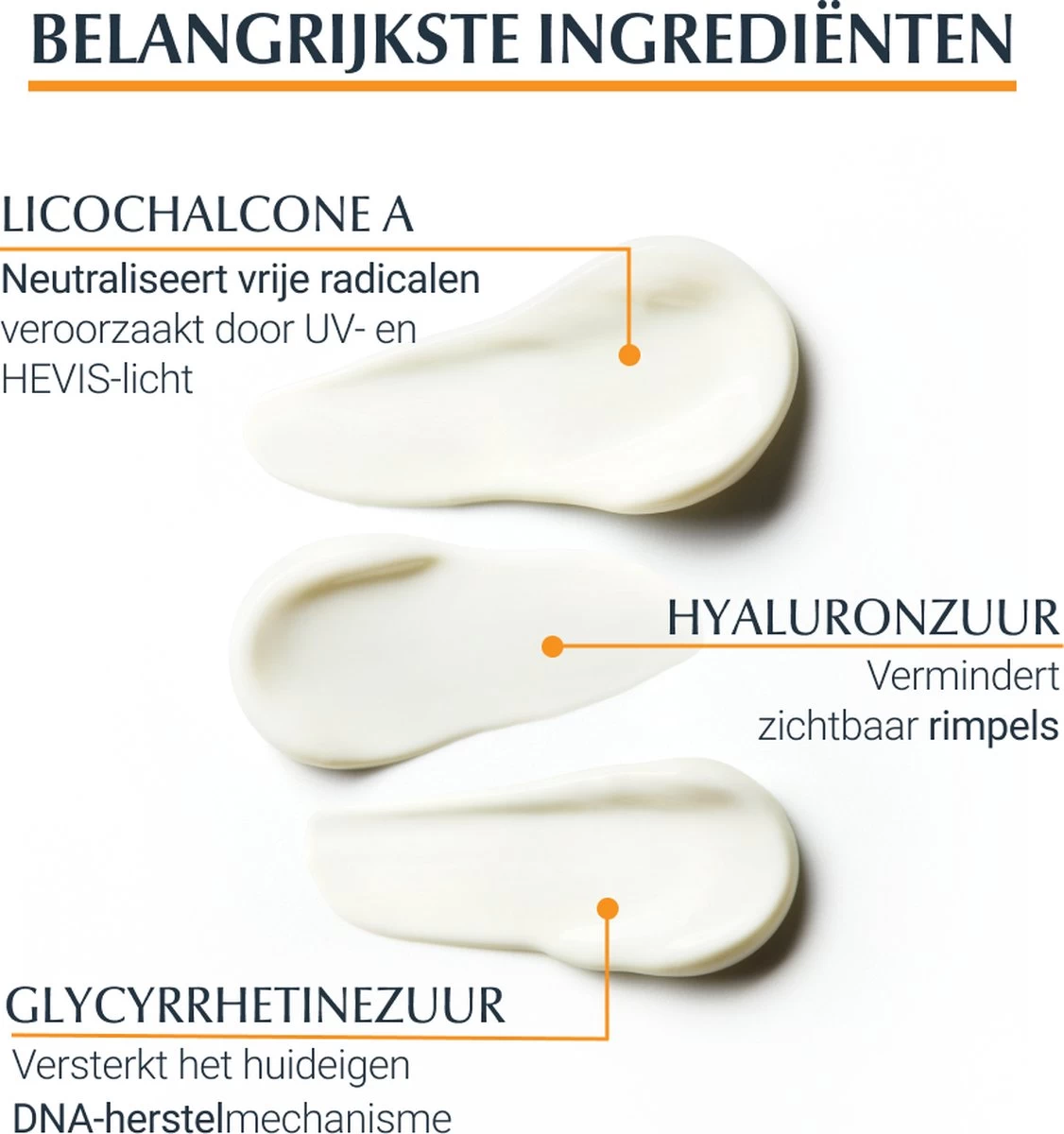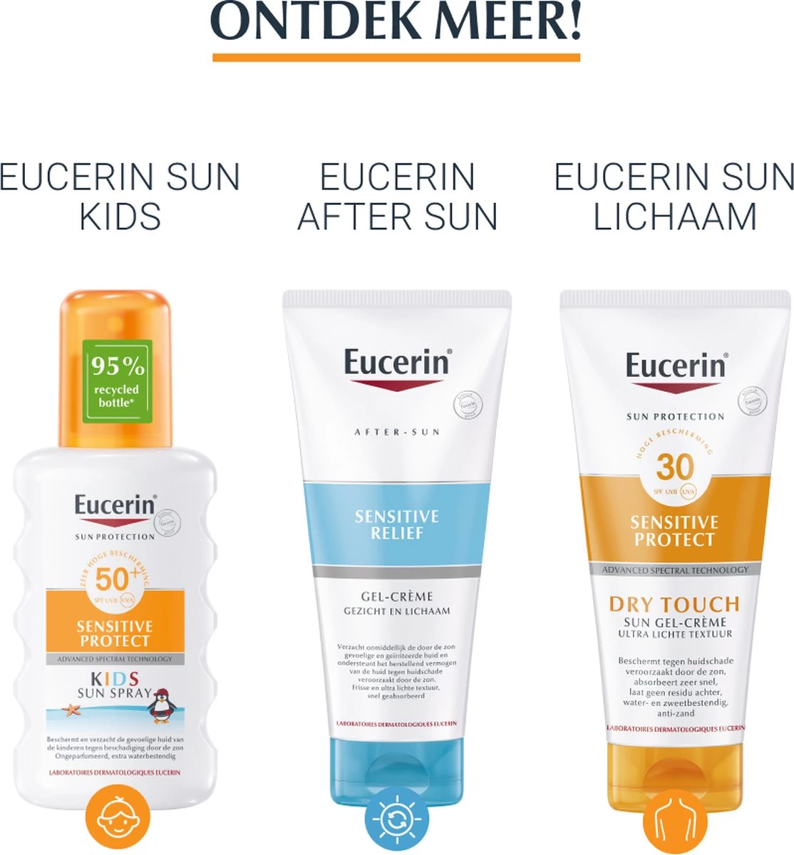 Eucerin Sun bevat effectieve UVA- en UVB-bescherming, plus, een unieke biologische celbescherming. Dit laatste bestaat uit een combinatie van glycyrrhetinezuur, dat de huideigen DNA-bescherming ondersteunt, en Licochalcone A, een krachtig antioxidant dat de huidcellen beschermt tegen schade veroorzaakt door vrije radicalen.