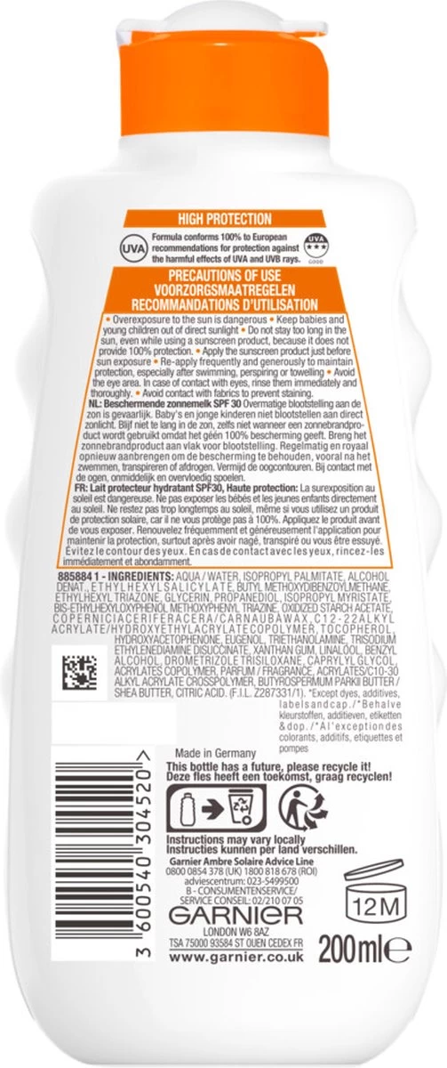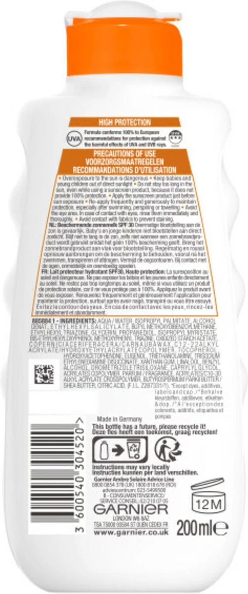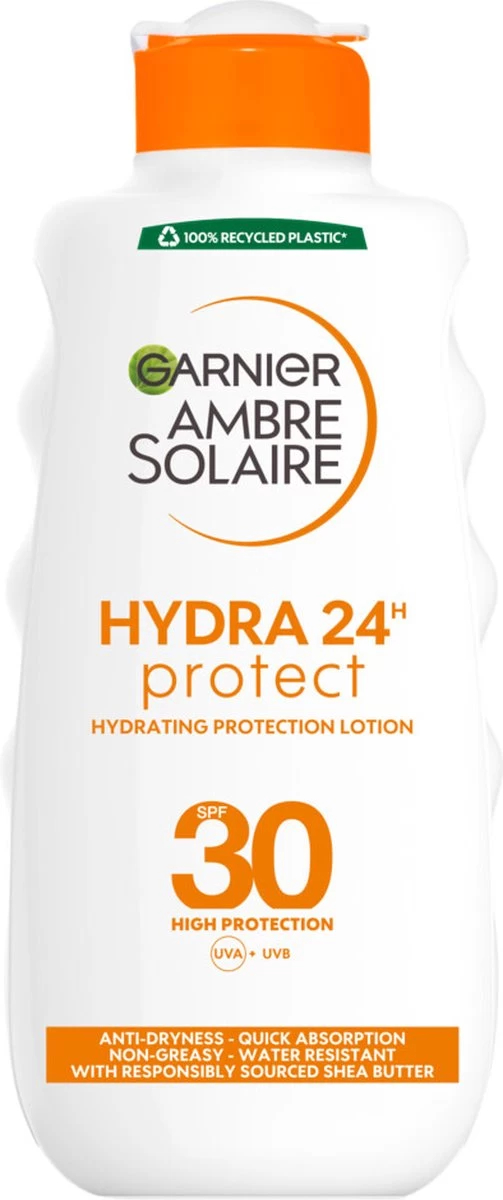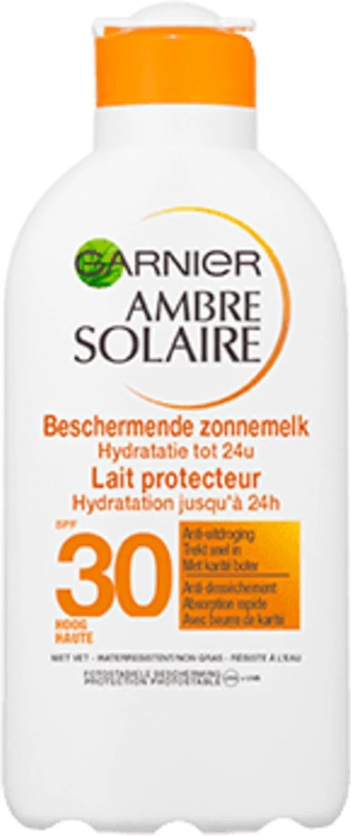 – Verzorg en bescherm je huid tegelijkertijd met de Garnier Ambre Solaire Hydraterende Zonnebrandcrème SPF 30. Deze zonnebrand beschermt de huid tegen de zon en voorkomt uitdroging.