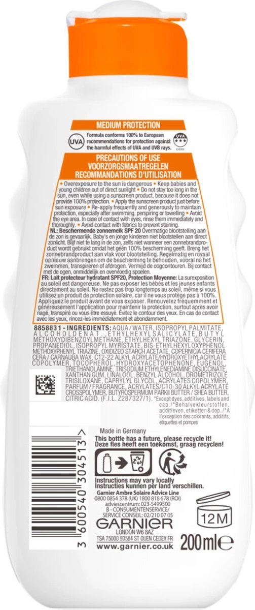 Verzorg en bescherm je huid tegelijkertijd met de Garnier Ambre Solaire Hydraterende Zonnebrandcrème SPF 20. Deze zonnebrand beschermt de huid tegen de zon en voorkomt uitdroging.