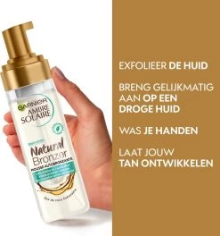 Stap 2: Zorg dat de huid droog is voordat de zelfbruiner gebruikt wordt. Breng de Garnier Ambre Solaire Self Tan Mousse aan en verdeel deze gelijkmatig over de huid.