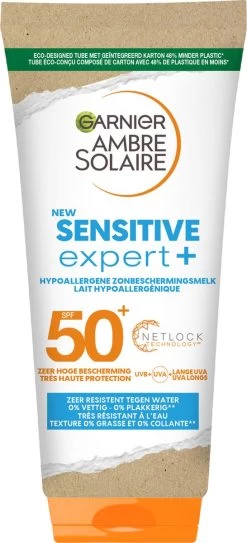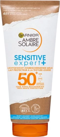 Garnier Ambre Solaire Sensitive Expert + Cardboard Tube Zonnebrandmelk SPF 50+ kan jij onbezorgd genieten van de zon tijdens jouw vakantie aan zee. Ambre Solaire Sensitive Expert + zonnemelk Cardboard Tube met een beschermingsfactor van 50+ biedt een verhoogde bescherming tegen lange UVA-stralen. Dit type UVA-straling komt het meest voor en dringt het diepst in de huid. Hierdoor treedt na verloop van tijd ernstige schade op: intolerantie, pigmentvlekken en beschadiging van het DNA. Getest onder medisch toezicht. Hypoallergene samenstelling. Zonder parabenen. Zonder parfum. Zonder kleurstoffen. Daarbij bevat deze eco-designed tube met geïntegreerd karton 48% minder plastic2.