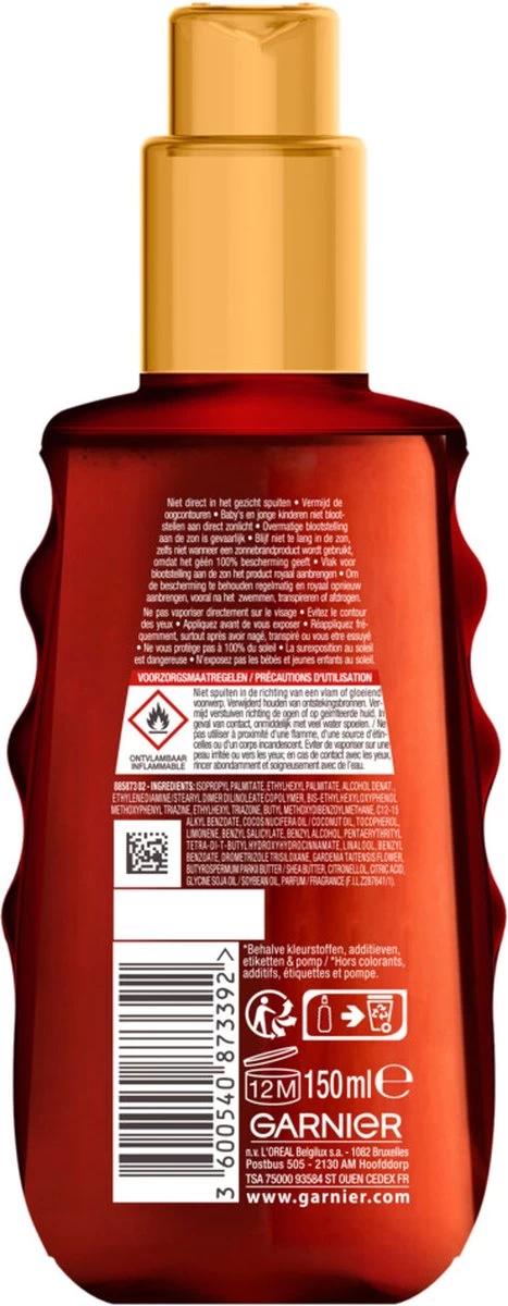 Wil je jouw zongebruinde huid een tijdje behouden? De Garnier Ambre Solaire Zonnebrandolie SPF 30 helpt jou bij het verkrijgen van een diepe, langdurige teint. De olie met karitéboter voedt de huid zonder vettig en plakkerig aan te voelen. Voor de optimale bruining. Plakt niet, waterresistent en voor een zachte huid.