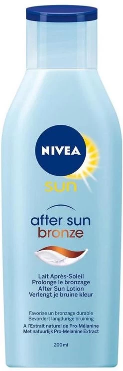 NIVEA SUN After Sun Bronze Hydraterende Lotion verlengt de natuurlijke bruine kleur met het natuurlijke Pro-Melanine-extract en biedt langdurige hydratatie voor de huid na blootstelling aan de zon. Voor een langdurige mooie bruine kleur. Vertrouw op het No.1* merk in zonbescherming. Alle Europese NIVEA Sun formules zijn vrij van octinoxate en oxybenzone, en respecteren daarmee de Hawaïaanse Wet**.