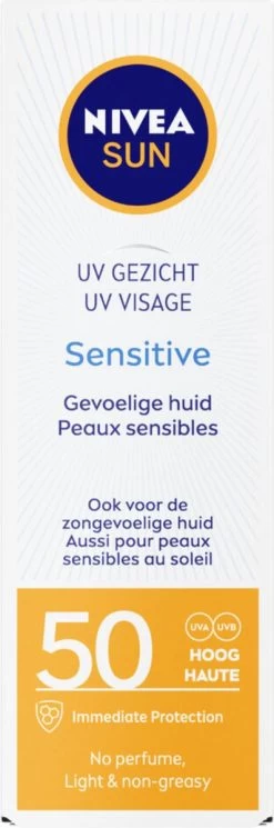 NIVEA SUN Face Sensitive Gezichtszonnecrème is speciaal ontwikkeld voor de gevoelige huid. Het biedt onmiddelijke bescherming tegen zonnebrand, huidirritaties en een trekkerig gevoel van de huid. De ongeparfumeerde, niet-vette textuur voelt licht aan en is ideaal voor dagelijks gebuik. Huidvriendelijkheid dermatologisch goedgekeurd.