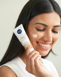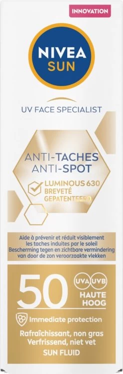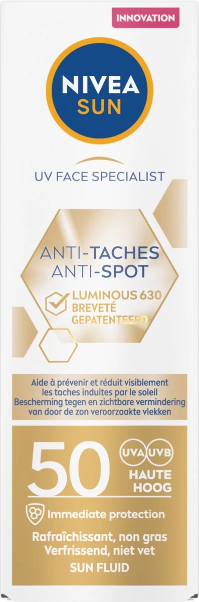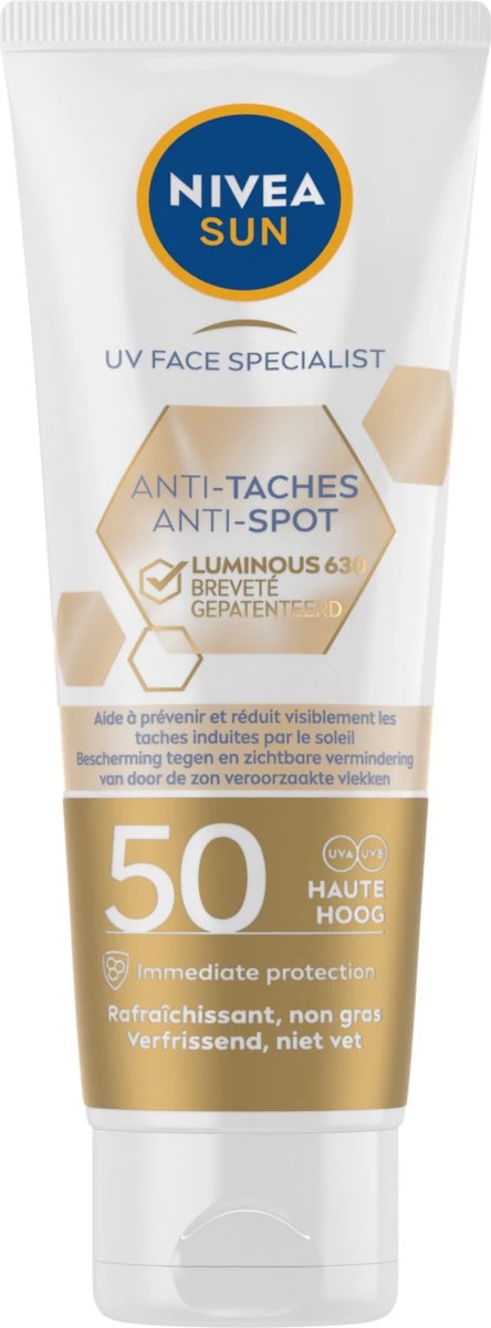 NIVEA SUN Face Luminous Anti-Spot SPF50 beschermt je tere gezichtshuid onmiddellijk tegen UV-stralen. Het voorkomt en vermindert zichtbaar door de zon veroorzaakte vlekken dankzij het gepatenteerde ingrediënt Luminous630. Voor een egale en stralende teint. De lichte en niet-vette zonnecrème zorgt voor een verfrissend effect. De formule respecteert de oceaan door vrij te zijn van UV-filters Octinoxate, Oxybenzone en Octocrylene.