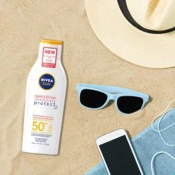 “Nieuw, voor de gevoelige huid! NIVEA SUN Sensitive Immediate Protect zonnecrème biedt hoge UVA bescherming tegen zonnebrand, dankzij de combinatie van UVA filters en antioxidanten. Speciaal geschikt voor de gevoelige huid en beschermt tegen huidreactie en irritaties veroorzaakt door de zon. De lichte, niet-vette formule is ongeparfumeerd en water resistent. Bevat Bio Aloë Vera.