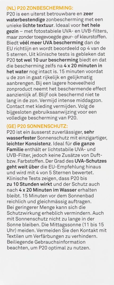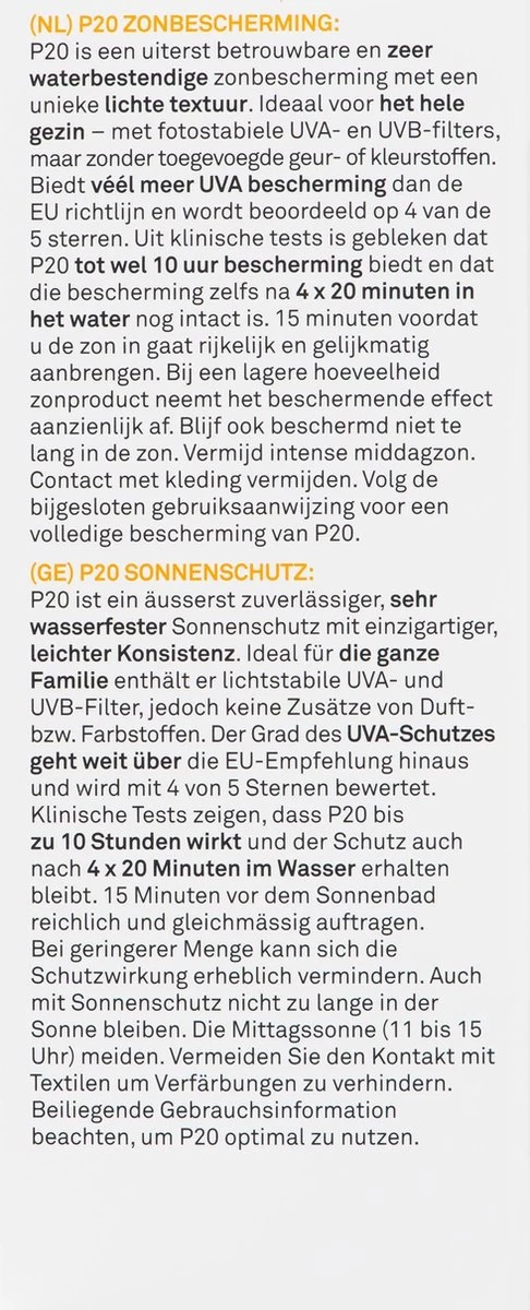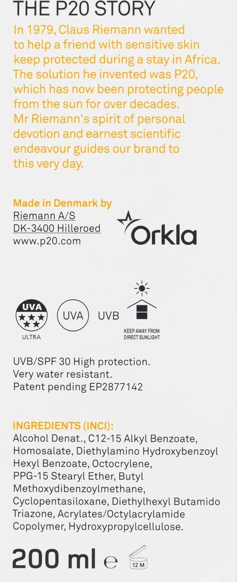 P20 is een van Riemann A/S, een Deens bedrijf dat gespecialiseerd is in huidverzorgingsproducten. Opgezet door Claus Riemann in de jaren ’70, die als ambitie had producten te creëeren die daadwerkelijk hun werk goed doen! In 1979 lanceerde Claus de eerste hoge-factor zonnebrand in de markt, die ook zorgde voor langdurige bescherming. Vandaag de dag is P20 erg bekend in het Verenigd Koninkrijk en is het over de hele wereld bekend.