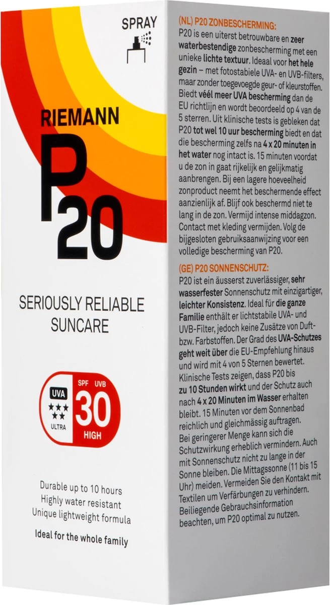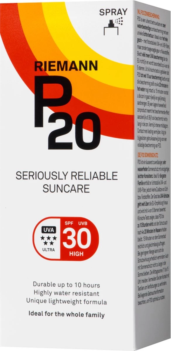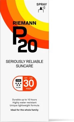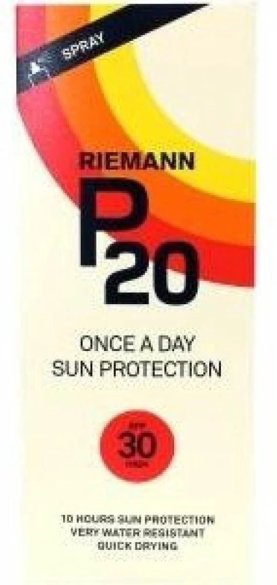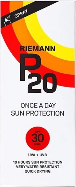 De Riemann P20 zonnebrandspray met factor 30 beschermt tegen het teveel aan UVA-stralen. De spray bevat een natuurlijke zonnefilter en is gegarandeerd water- en transparantiebestendig. Een extra voordeel van deze spray is dat deze slecht 1 keer per dag moet worden aangebracht.