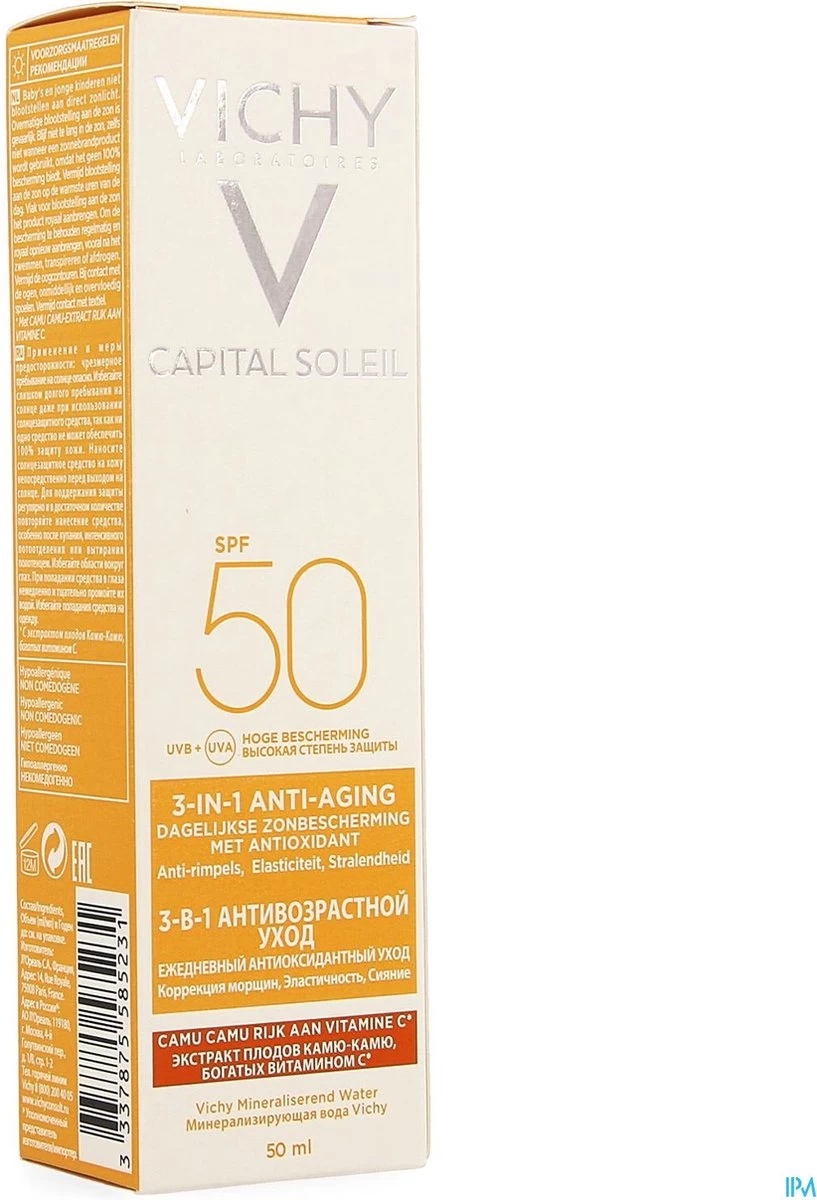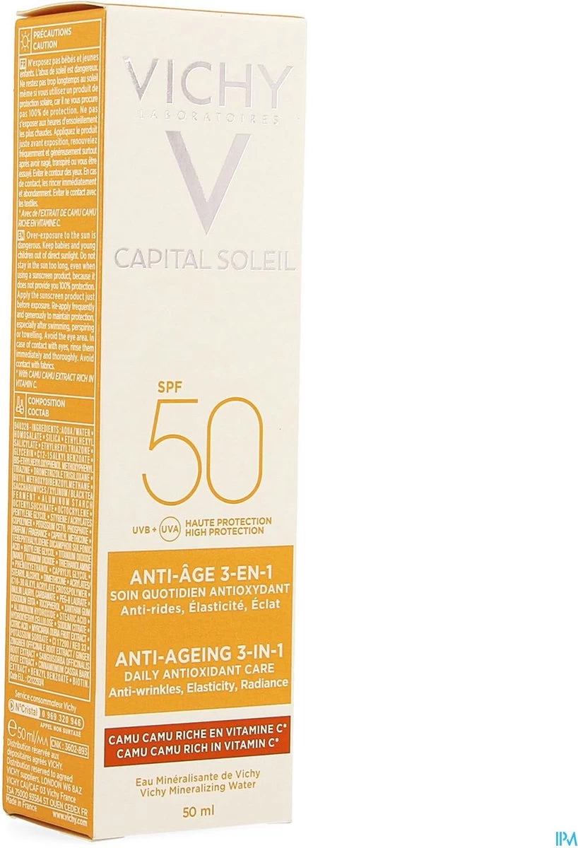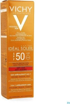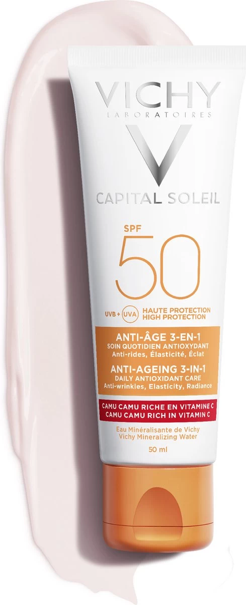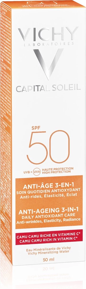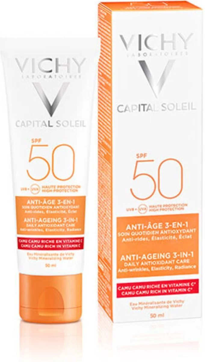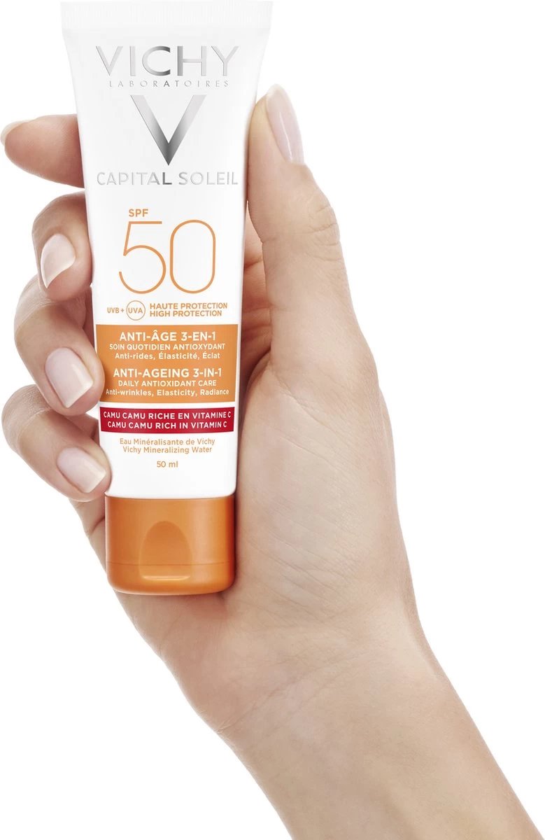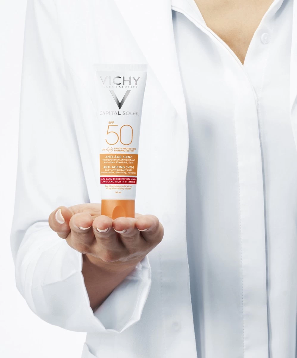 Capital Soleil Anti-Age SPF50 beschermt de huid effectief tegen UV-stralen, volgens onderzoek Alle producten van Vichy worden getest zodat ze effectief en geschikt zijn voor elk huidtype.