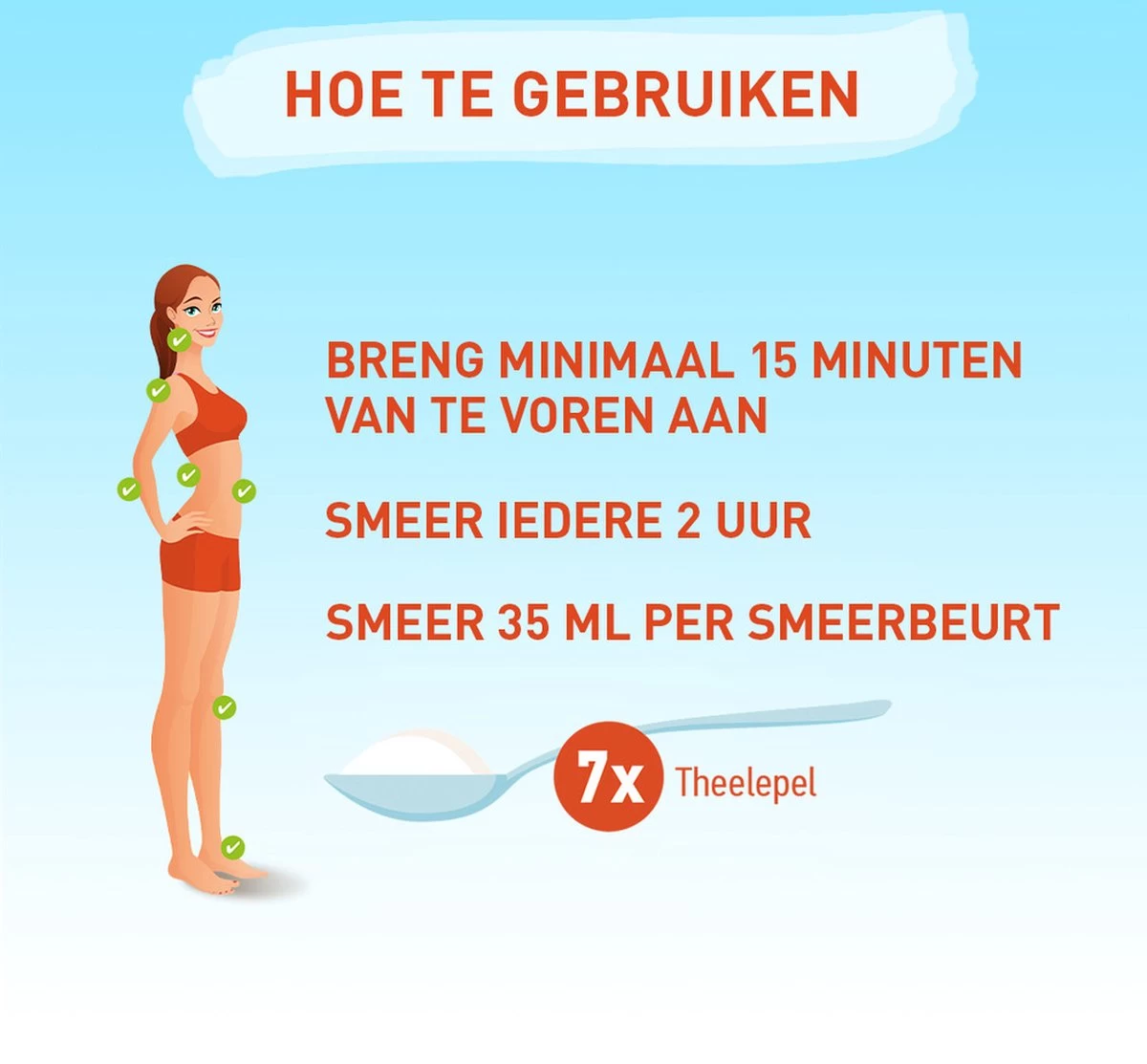 - Smeer royaal (als volwassene 35 ml per keer), regelmatig en zorgvuldig.