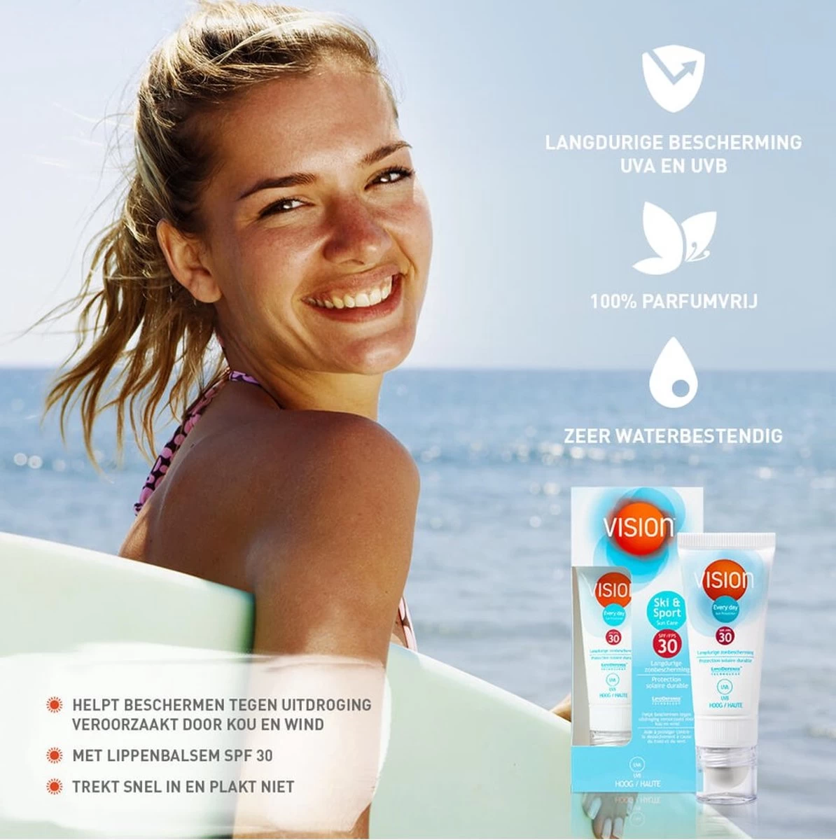 - Mede door de LypoDefenseTM technologie biedt Vision langdurige* en zeer waterbestendige zonbescherming, waardoor je beschermd bent gedurende het sporten.